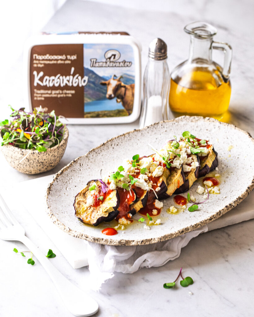 Ψητές φέτες μελιτζάνας με σάλτσα ντομάτας και Κατσικίσιο Τυρί Παπαθανασίου