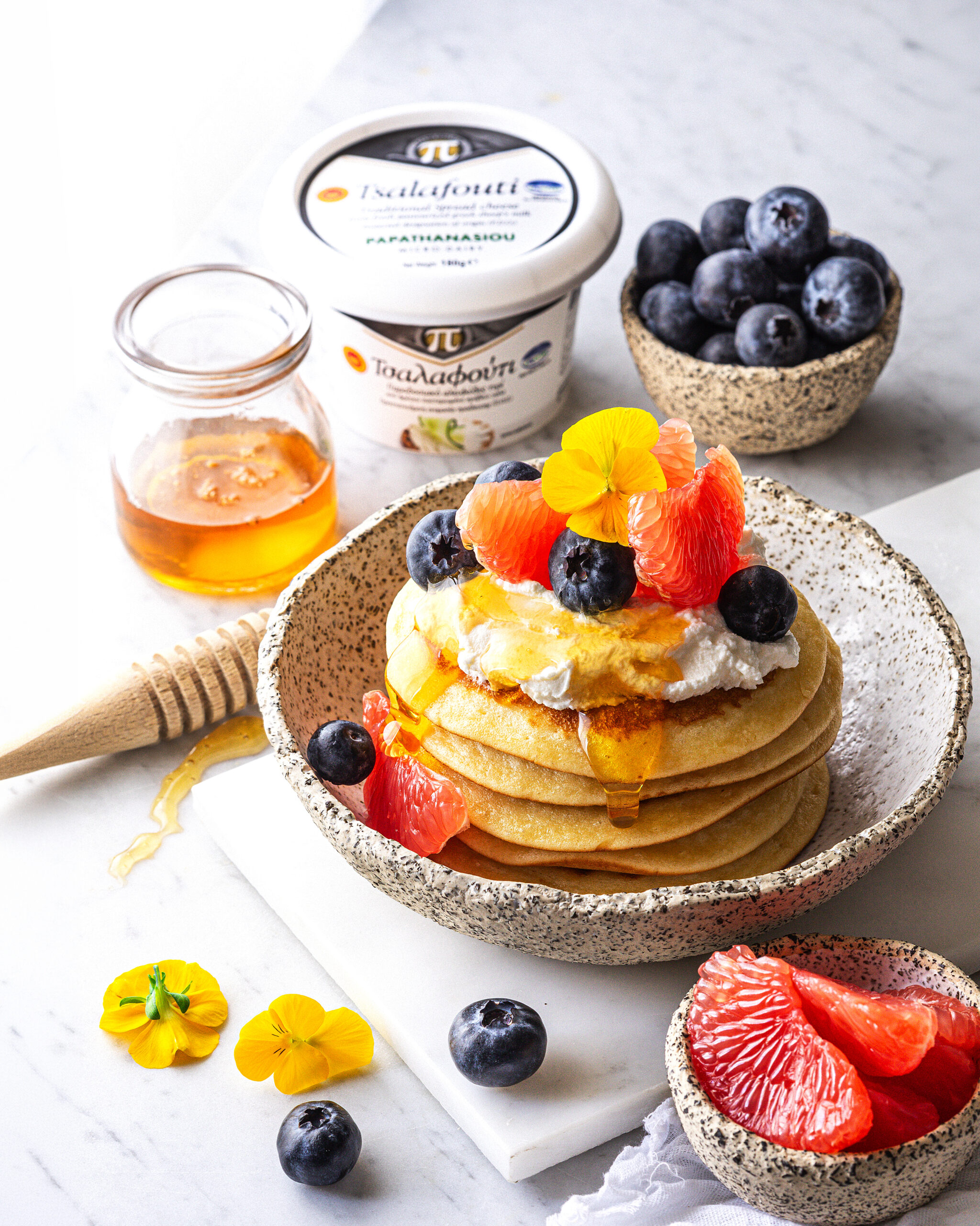 Pancakes με Τσαλαφούτι Παπαθανασίου, μέλι, blueberries και pink grapefruit